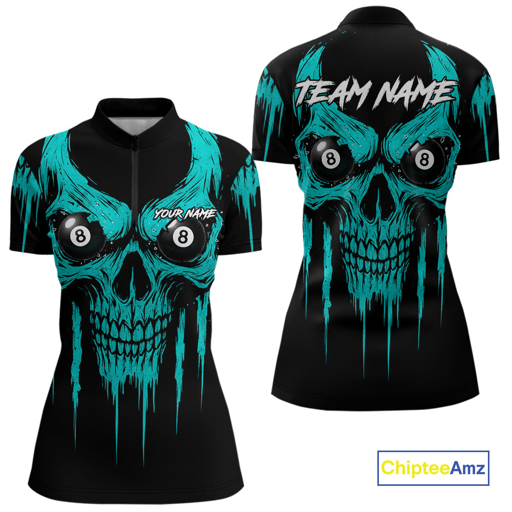 Turquoise Grunge Skull Billiard Jersey For Women Custom 8 Ball Pool Billiard Shirt Polo & 1/4 Zip TDM5074