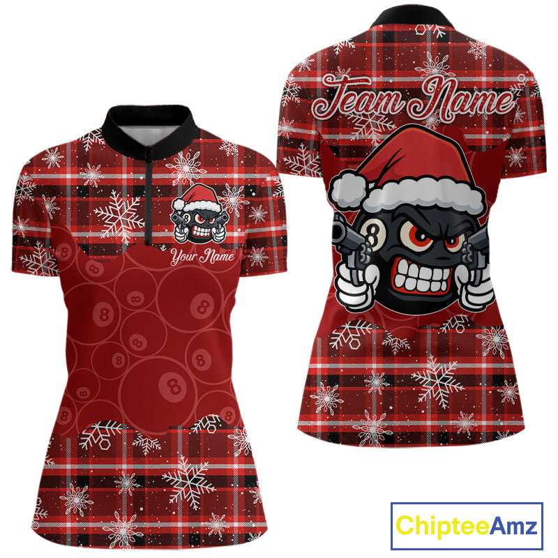 Funny Santa 8 Ball Pool Women's Billiard Shirt Custom Red Plaid Snowflake Christmas Billiard Jersey TDM5223
