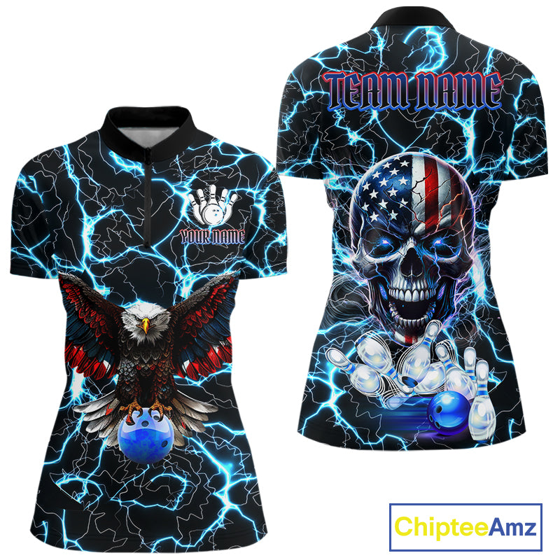 American Flag Eagle Skull Blue Lightning Thunder Women Bowling Shirts Custom Bowling Team Jersey NQS10725