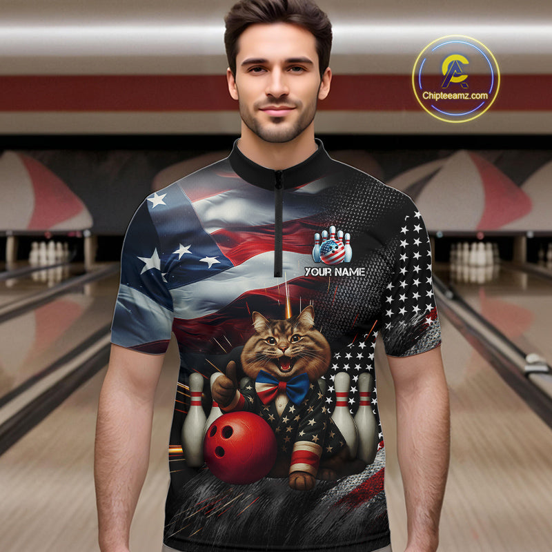 American Flag Funny Cat Bowling Shirt for Men Custom Bowling League Jersey Polo & 1/4 Zip Shirt QZT807