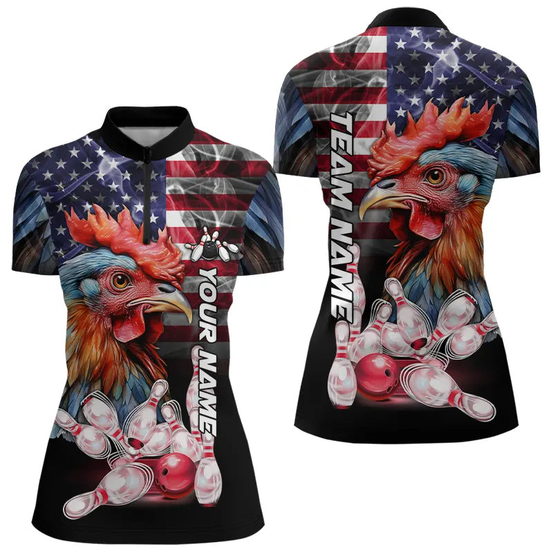 American Flag Rooster Bowling Polo, Quarter Zip Shirts for Women Custom patriotic Team Bowling jerseys NQS9296