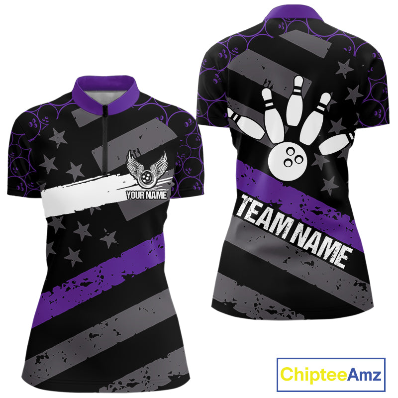 Black American flag Women bowling shirts Custom bowling camo Team Jerseys, gift for Bowlers | Purple NQS10897