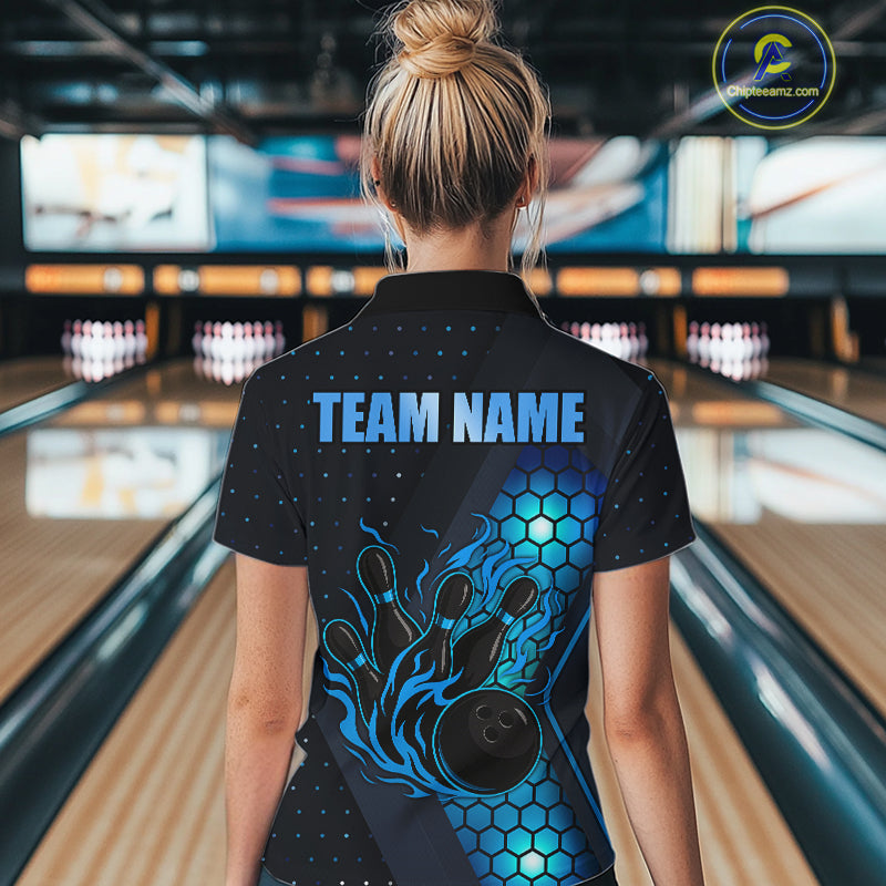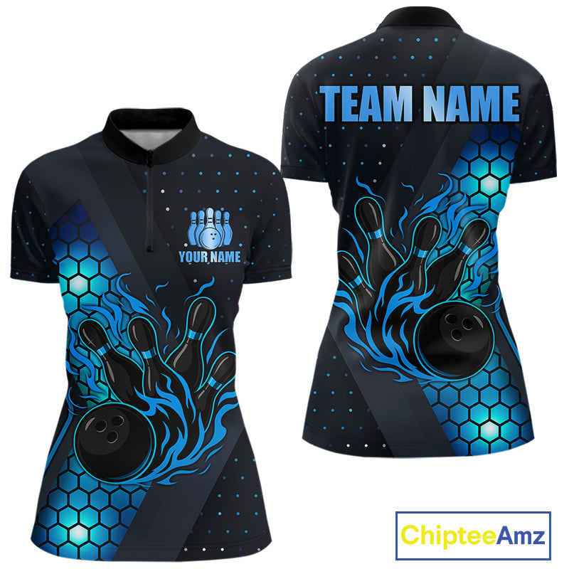 Black and Blue Flame Bowling Polo, 1/4 Zip Shirts for Women Custom Bowling Team Jersey Bowler Outfit NQS10925