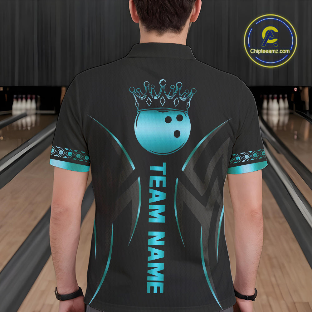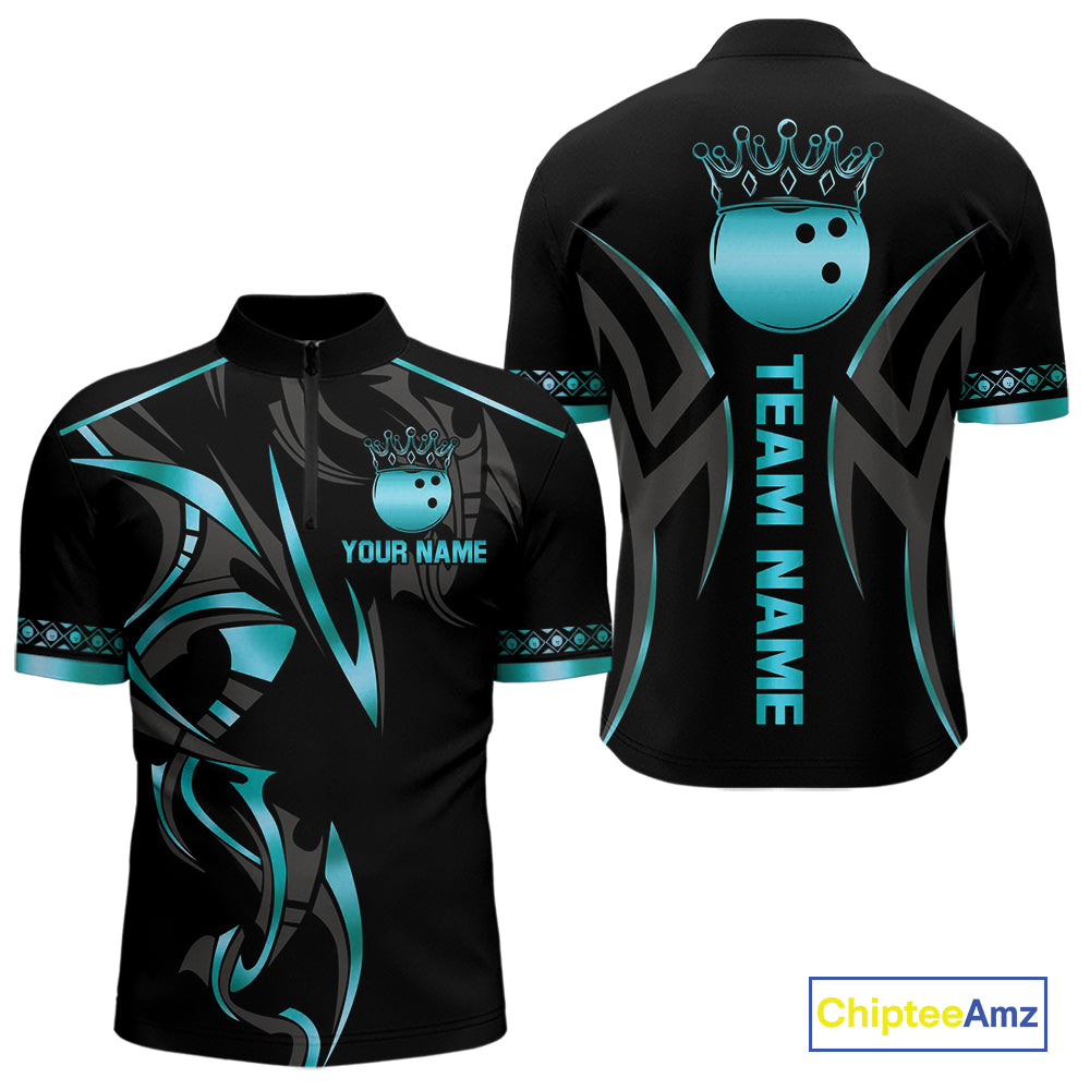 Black and Cyan Blue crown Bowling ball Polo, Quarter Zip Shirts for Men Custom Bowling Team jerseys NQS10075