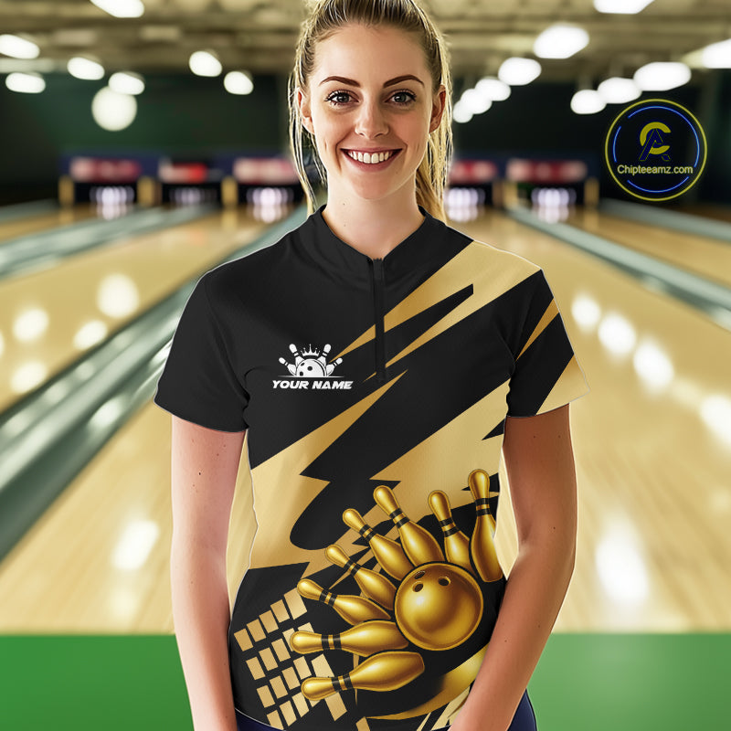 Black and Gold Bowling Polo, Quarter Zip Shirt For Women Custom Team bowling jersey, gift for bowlers NQS11069