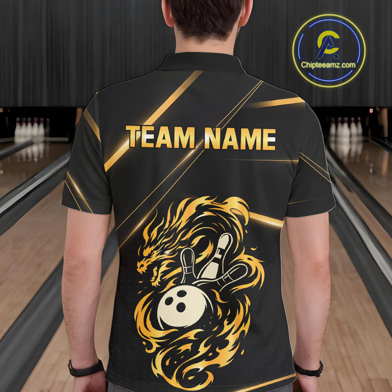 Black and Gold Flame Dragon Bowling Polo, Quarter Zip Shirt for Men Custom Bowling Team League Jersey NQS10904