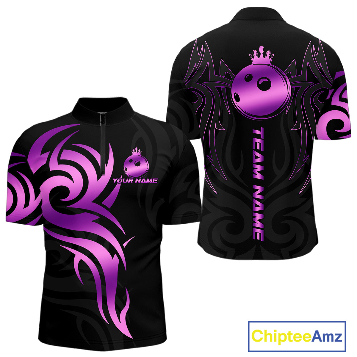 Black and Purple crown Bowling ball Polo, Quarter Zip Shirts for Men Custom Bowling Team jerseys NQS10732
