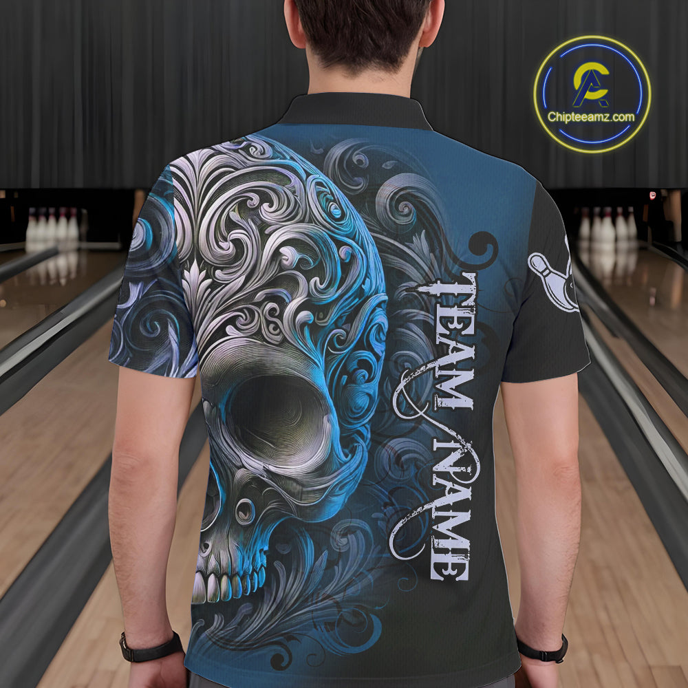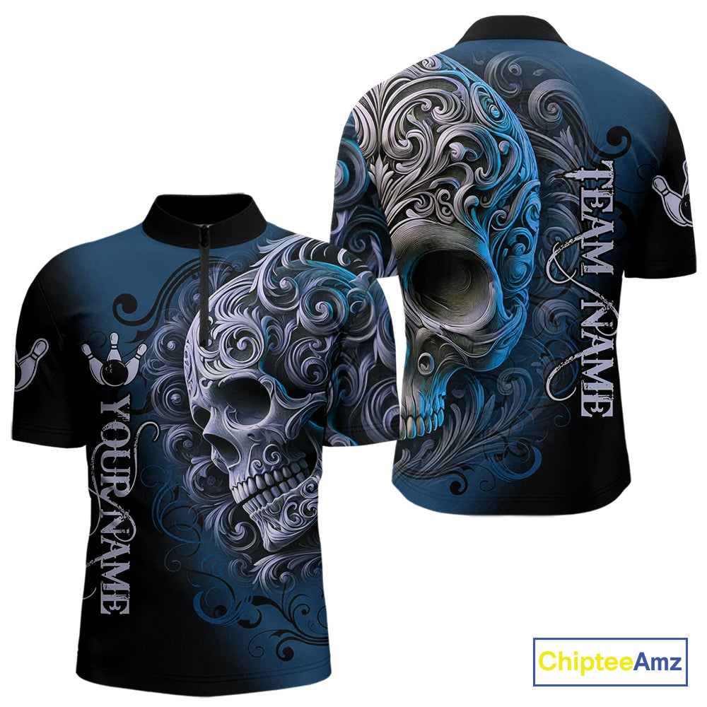 Blue and Black Skull Scroll Men Bowling Polo, Quarter Zip Shirts Custom Skull Team bowling Jersey NQS10939