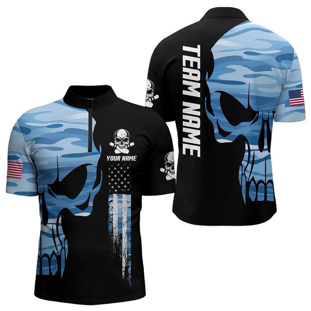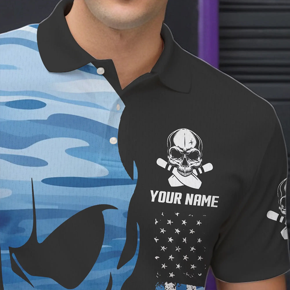 Blue Camo Skull American Flag Mens Bowling Shirts Custom Patriotic Bowling Team Jerseys For Men NQS9507