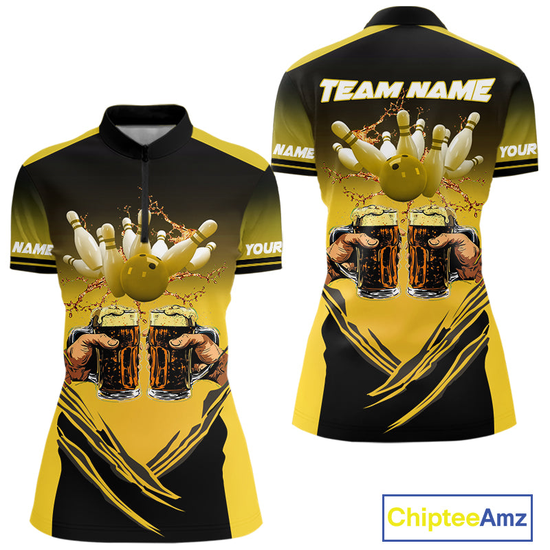 Bowling Beer Black and Yellow Bowling Polo, 1/4 Quarter zip shirts Custom Women Team Bowling jerseys NQS10875