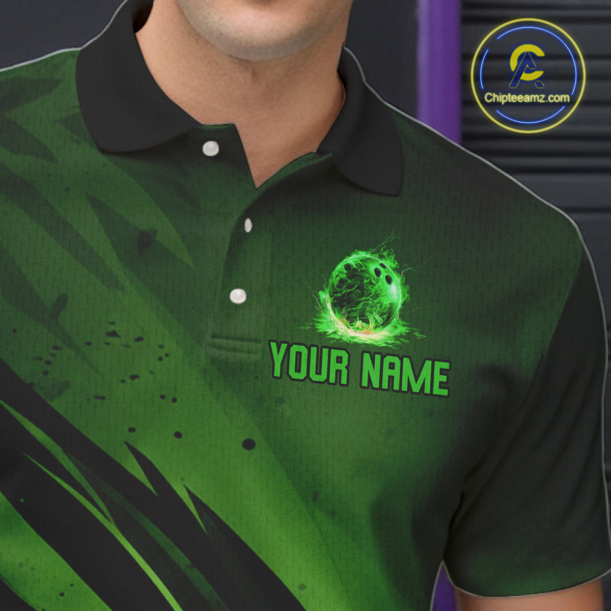 Custom Black and Green Flame Mens Bowling Shirts, Bowling Polo, 1/4 Zip Team Jerseys NQS11130