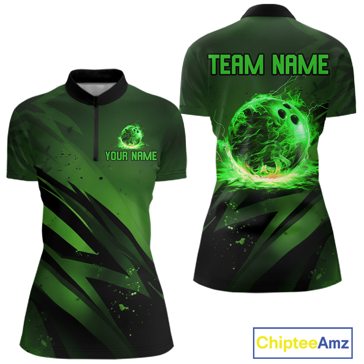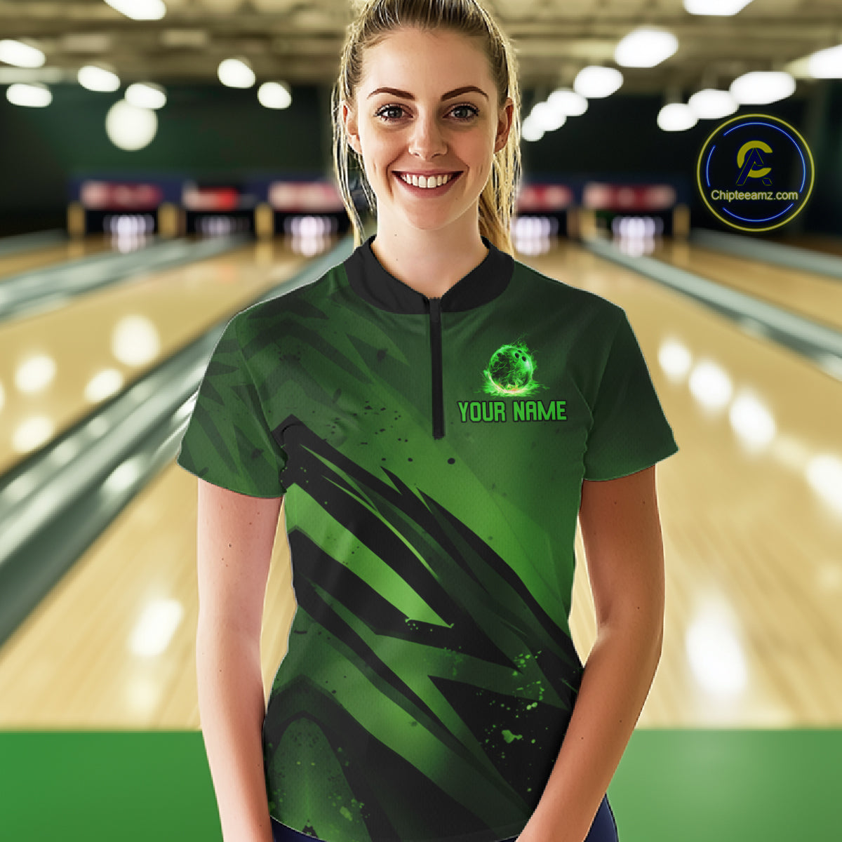 Custom Black and Green Flame Womens Bowling Shirts, Bowling Polo, 1/4 Zip Team Jerseys NQS11130