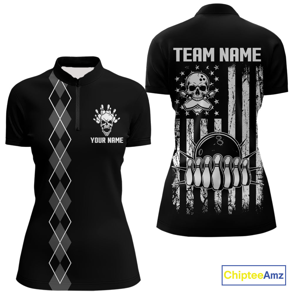 Custom Black and White argyle American Flag Skull retro Womens Bowling Shirts patriotic Team Jerseys NQS11131