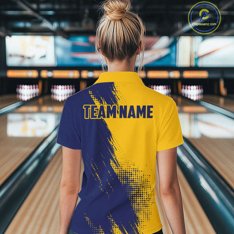 Custom Blue and Yellow Strike Bowling Shirts Women Polo, 1/4 Zip Bowling Team Jerseys Bowling League NQS11039