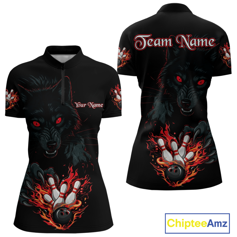 Custom Flame Wolf Bowling Jersey for Women Bowling Uniform Polo & 1/4 Zip Bowling Team Shirts HNT144