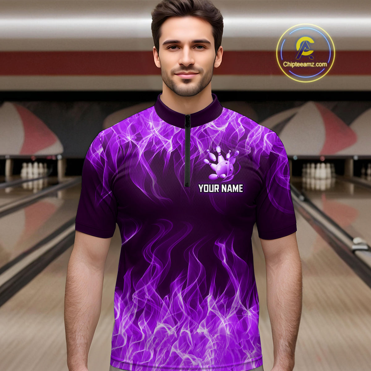 Custom Purple Flame Bowling Jersey for Men Polo & 1/4 Zip Bowling Team Shirts Bowling League HNT150
