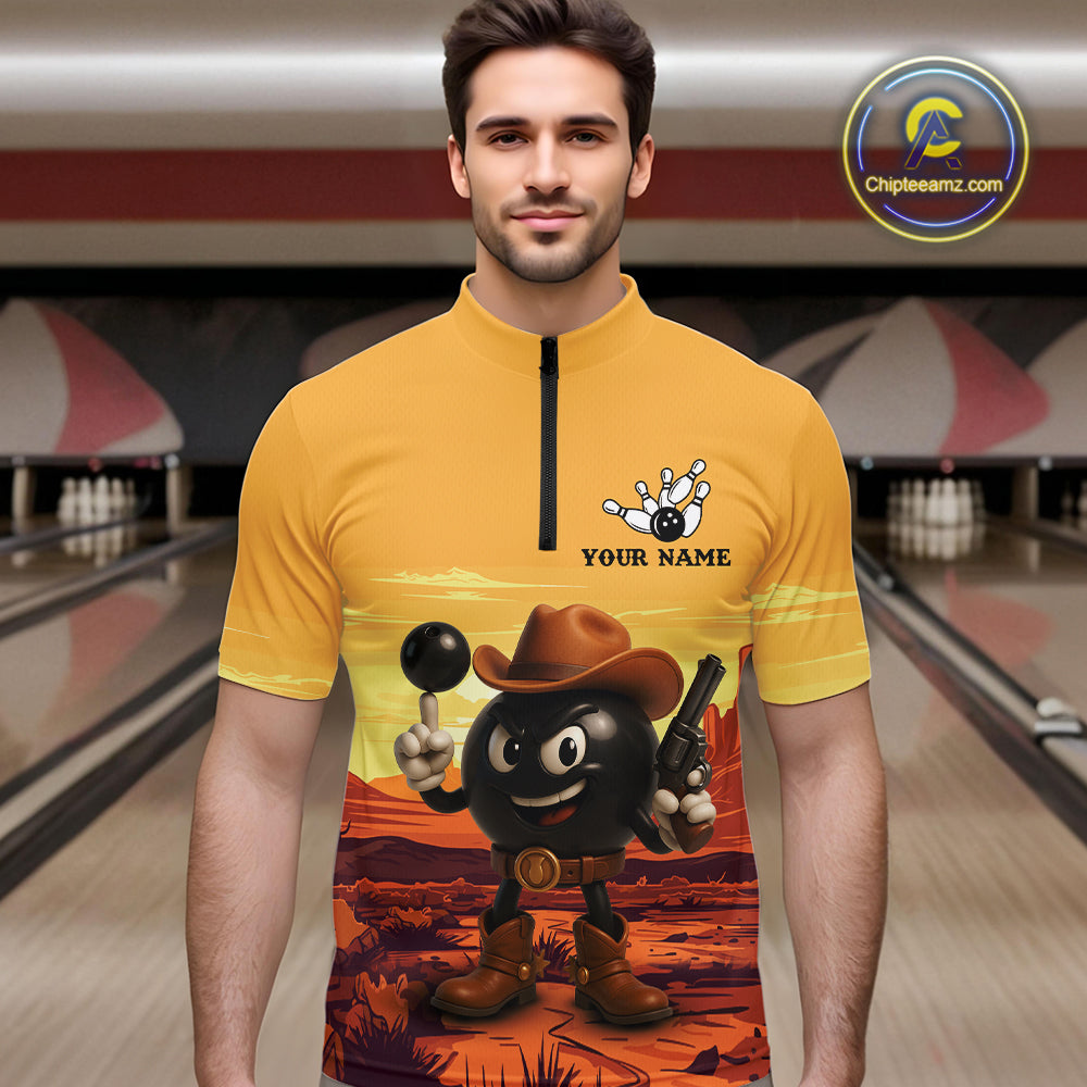 Funny Bowling Cowboy gun desert Mens Bowling Polo, 1/4 Zip Shirts Custom Funny bowling team jerseys NQS11127