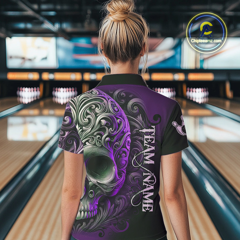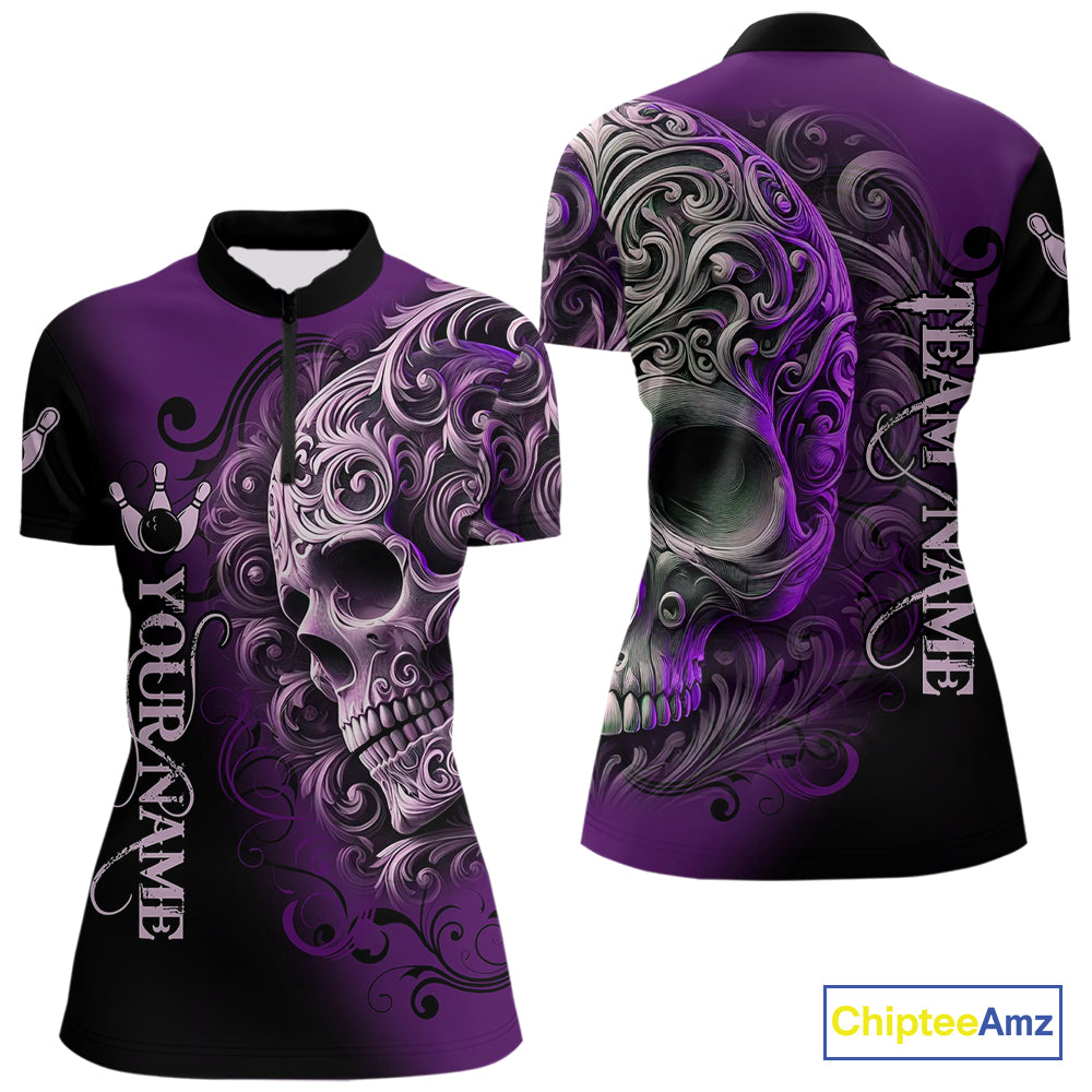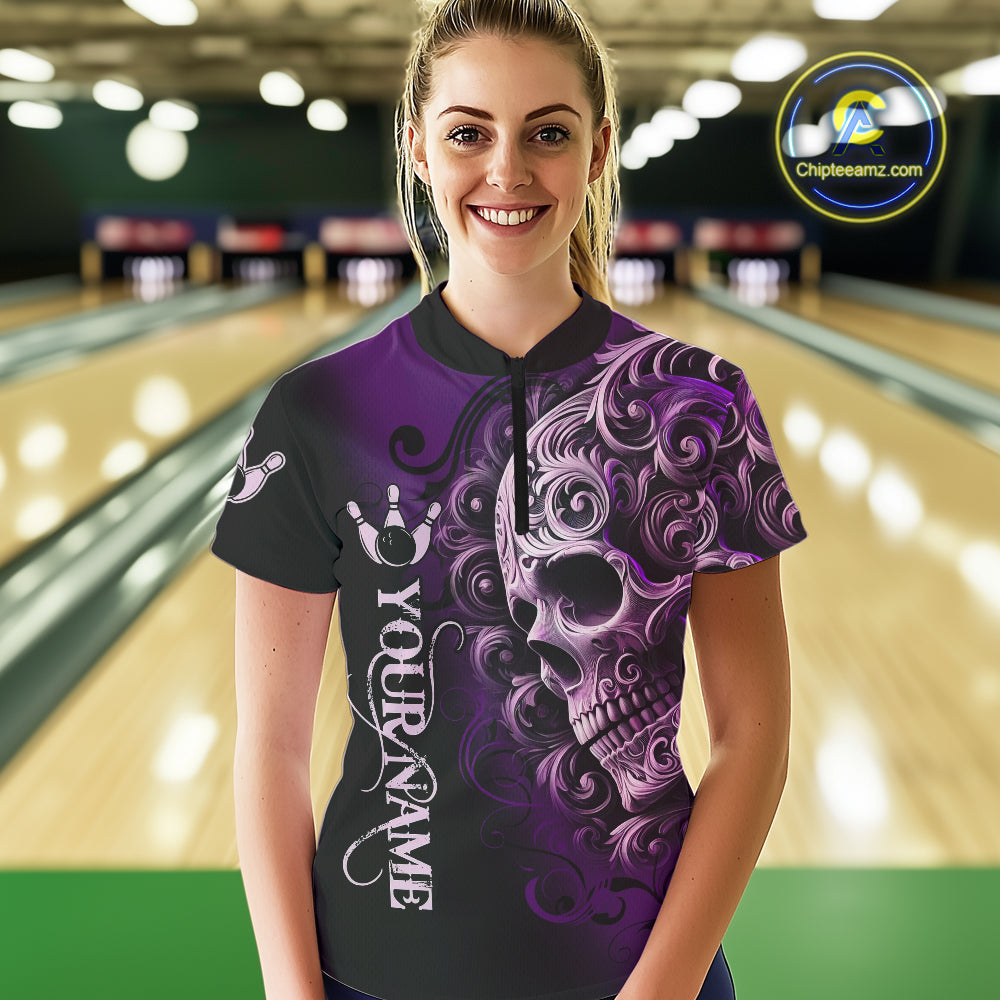 Purple and Black Skull Scroll Women Bowling Polo, Quarter Zip Shirts Custom Skull Team bowling Jersey NQS10941