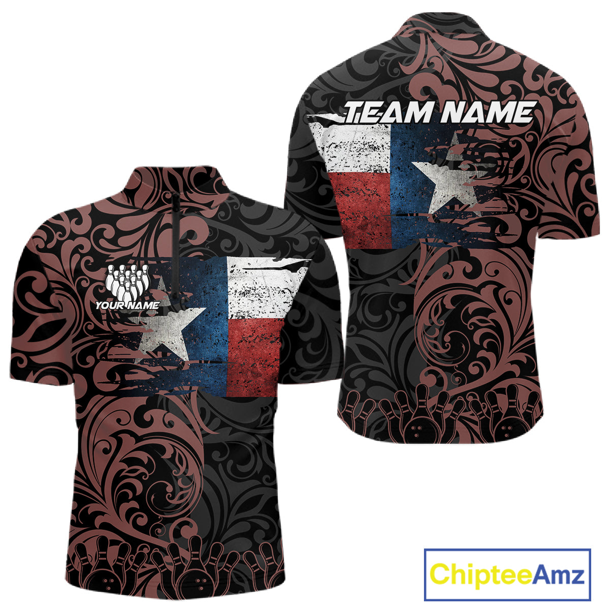 Texas Flag tribal pattern Bowling Polo, 1/4 Zip shirts for men Custom patriotic Team bowling jersey NQS10583