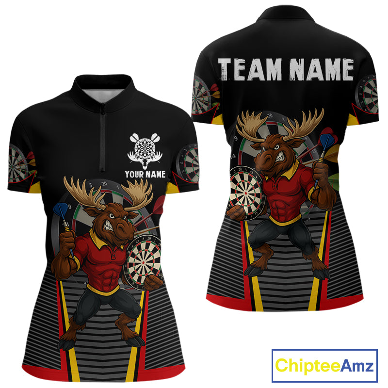 Black and Red Funny Moose Darts Polo, Quarter Zip Shirts For Women Custom Darts Team Jerseys NQS11065