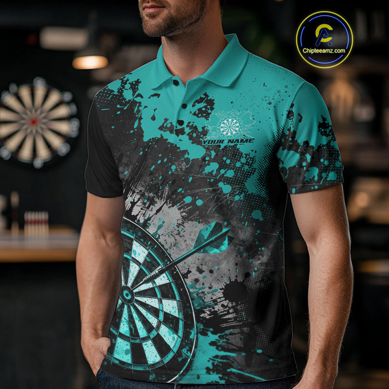 Custom Black And Blue-Green Splatter Dart Men Polo Shirt, Grunge Style Dart Team Jerseys IPHW10055