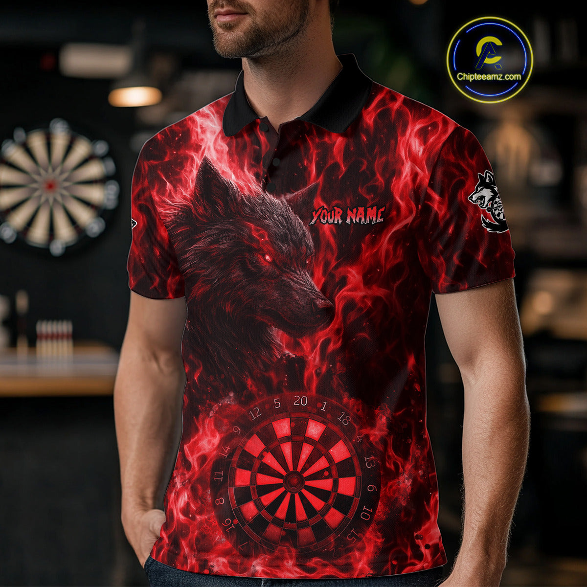 Custom Black Blue Flames Wolf Dartboard Dart Men Polo Shirt Outfits Dart Jerseys NYN1618