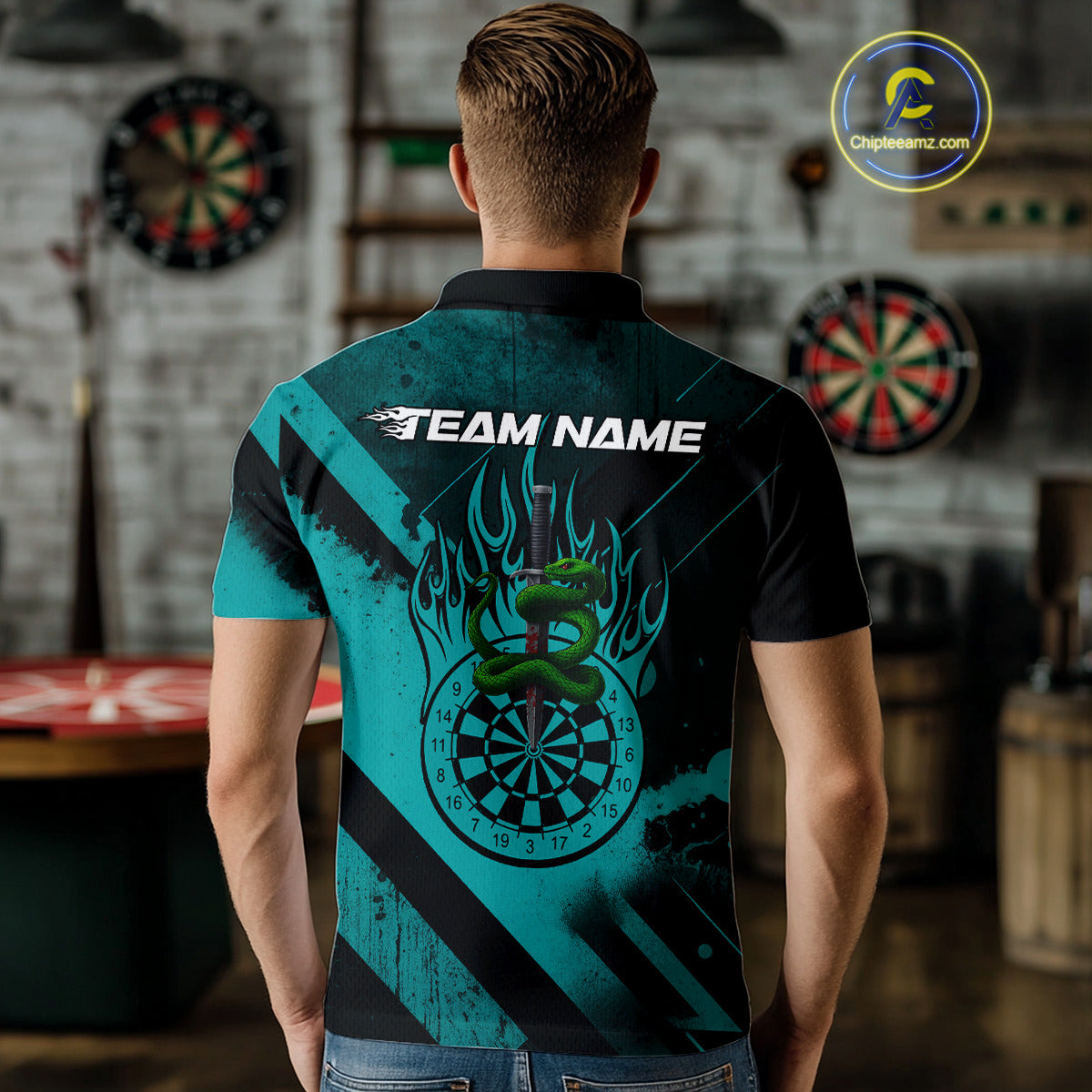 Custom Green Cobra Flames Dartboard Turquoise Grunge Dart Men Polo Jerseys Dart Shirt Gifts NYN1644