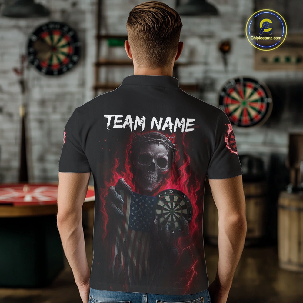 Custom Red Flames Skeleton USA Flag Dart Men Polo Jerseys Patriotic Dart Team Shirt NYN1699