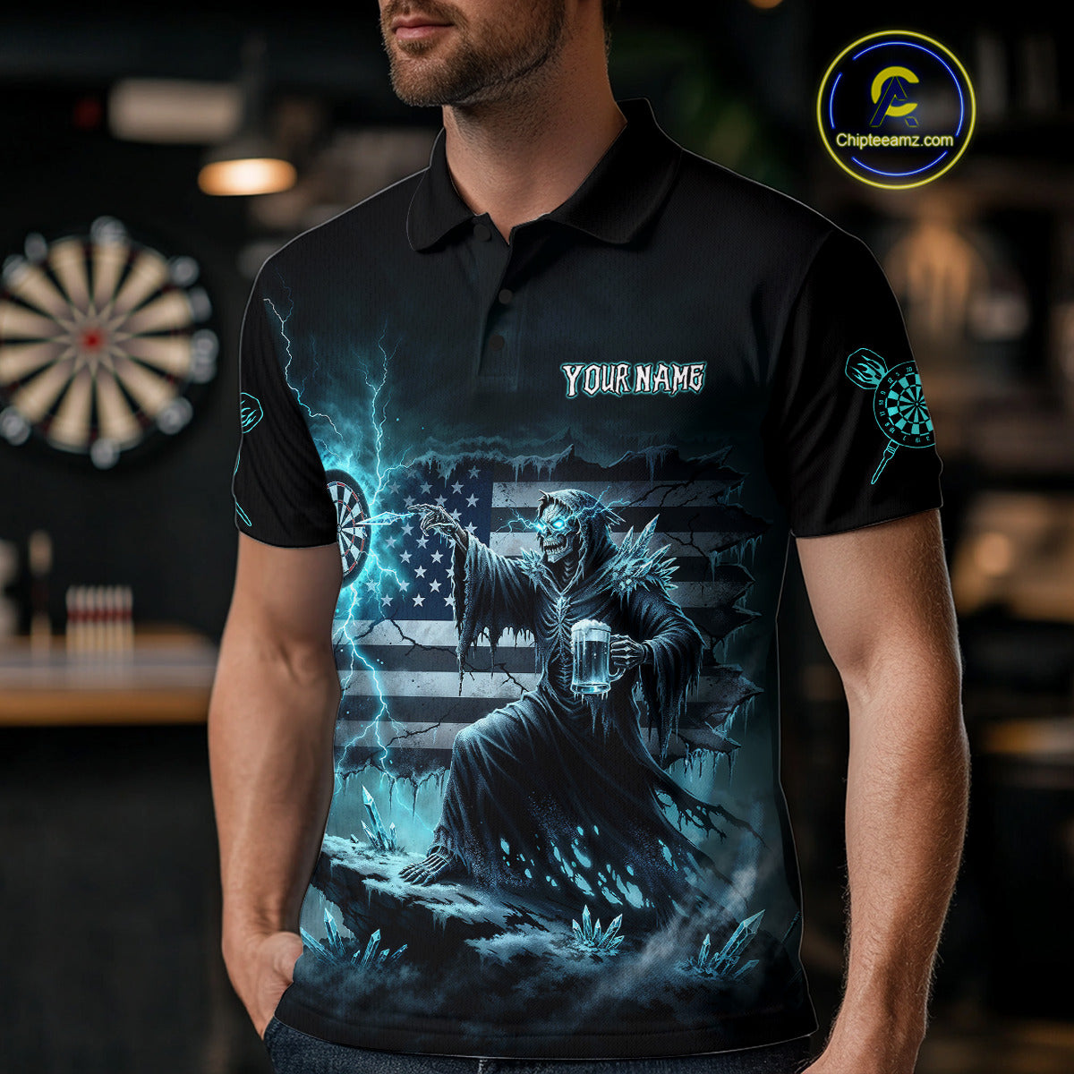 Custom Lightning Turquoise Grim Reaper Beer Funny Men Darts Polo Shirt US Flag Dart Jerseys NYN1836