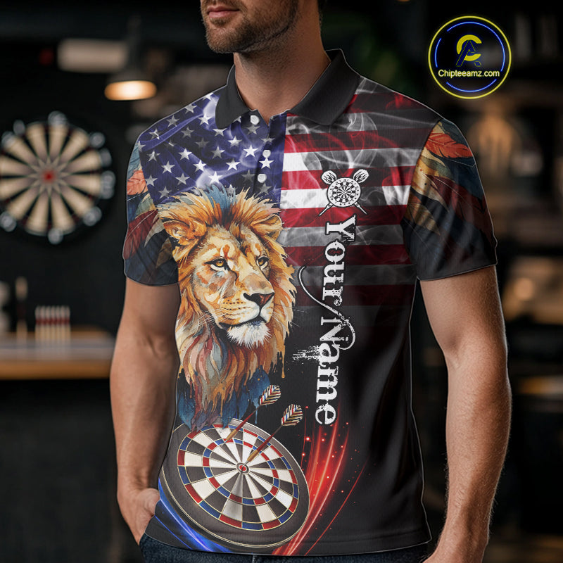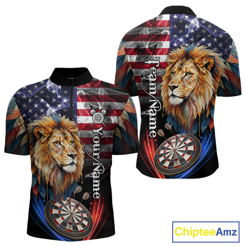 American Flag Smoke Lion Darts Shirt For Men Custom Patriotic Darts Jersey Team Polo, 1/4 Zip TDM5258