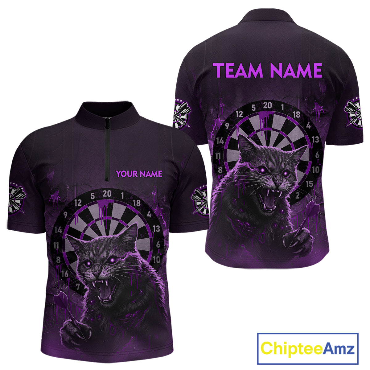 Funny Cat Purple Dripping Dartboard Custom Men's Quarter-Zip Darts Shirt Outfits Darts Jersey NYN1802