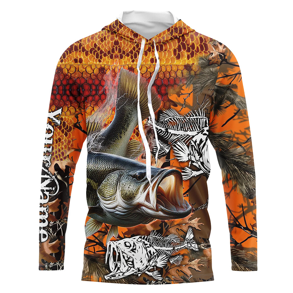 Largemouth Bass fishing orange camo performance long sleeve fishing shirt, Bass fishing jerseys NQS4293