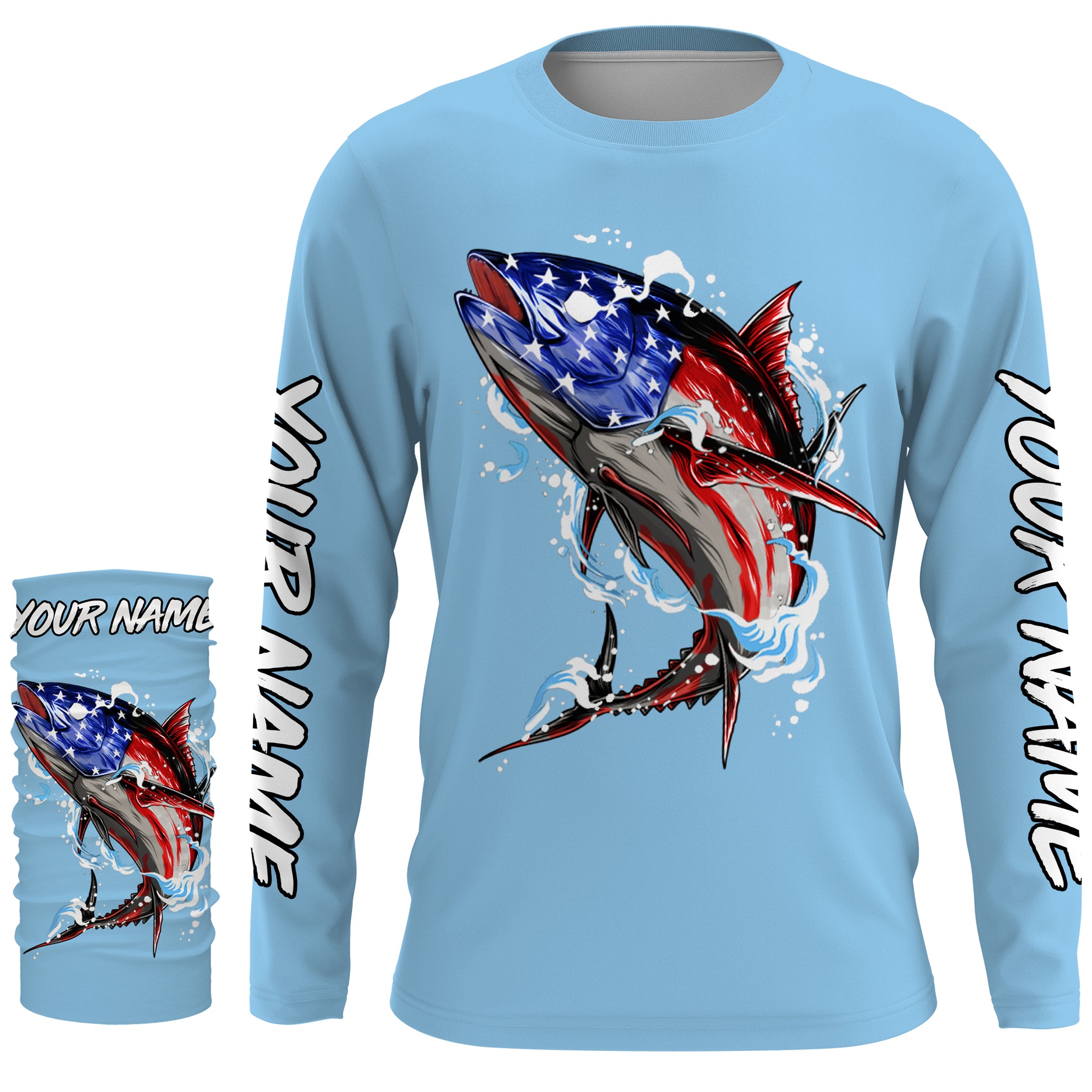 Tuna fishing American flag custom name sun protection long sleeve fishing shirts jerseys | Sky Blue NQS3852