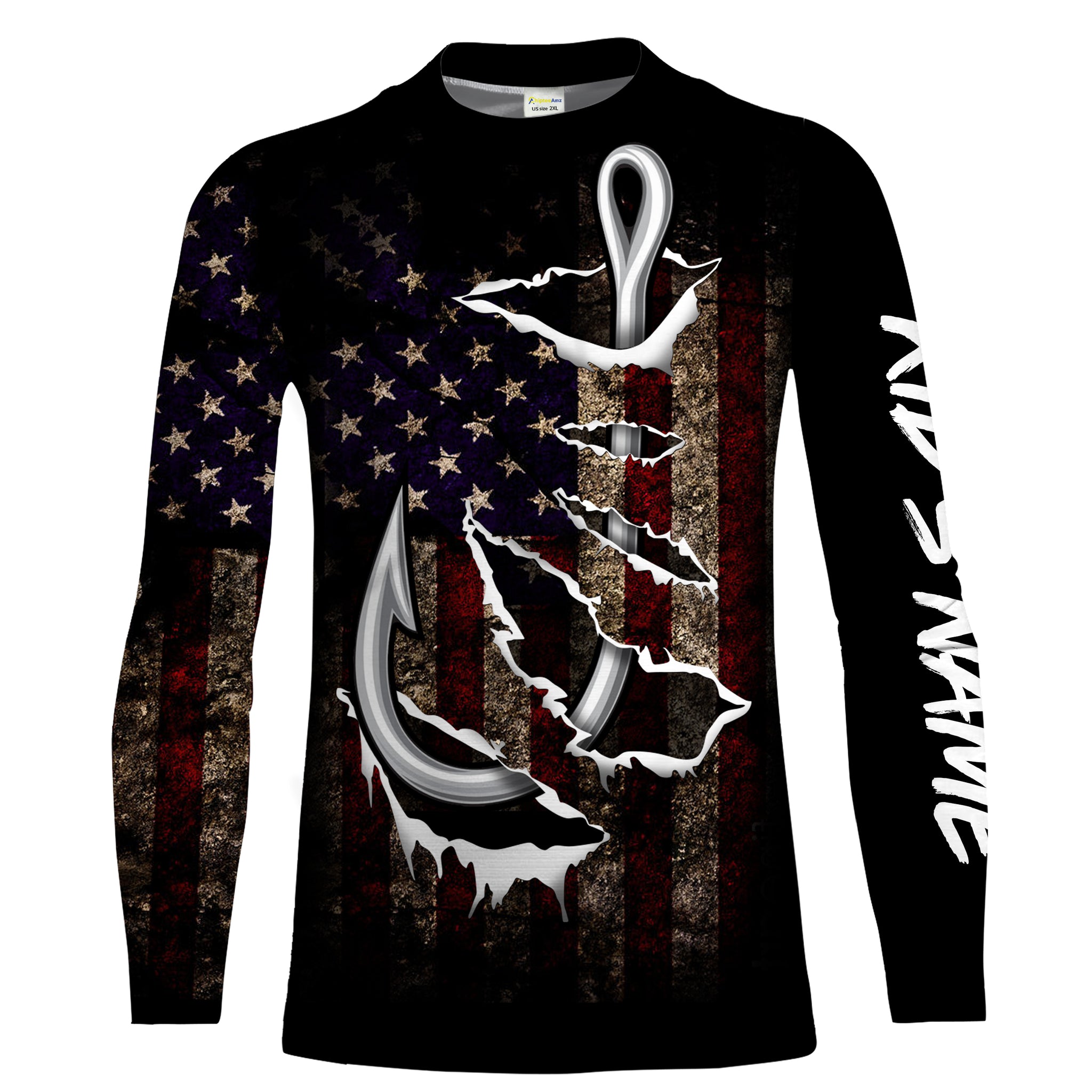 US Fishing 3D Fish Hook American Flag patriotic UV protection customize name long sleeves shirts UPF 30+ fishing apparel NQS2161