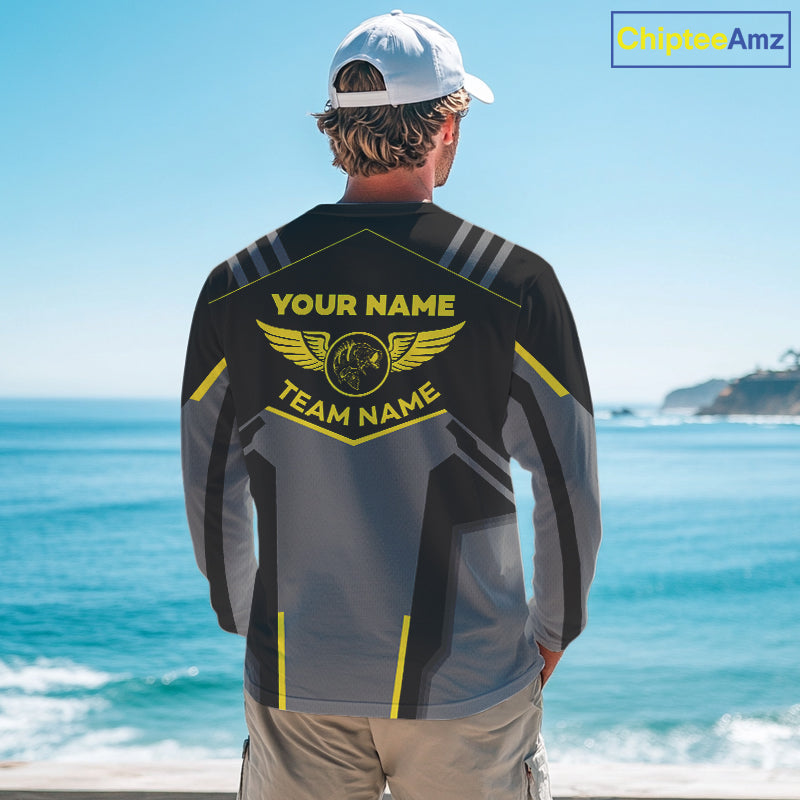 Personalized Black Peacock Bass Fishing jersey, Team Bass Fishing Long Sleeve tournament shirt| Yellow NQS9823