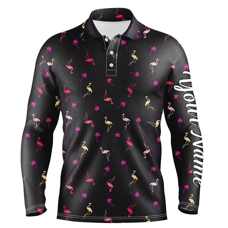 Black Mens golf polo shirt neon pink flamingos palm pattern custom team flamingo golf polo shirts NQS4952