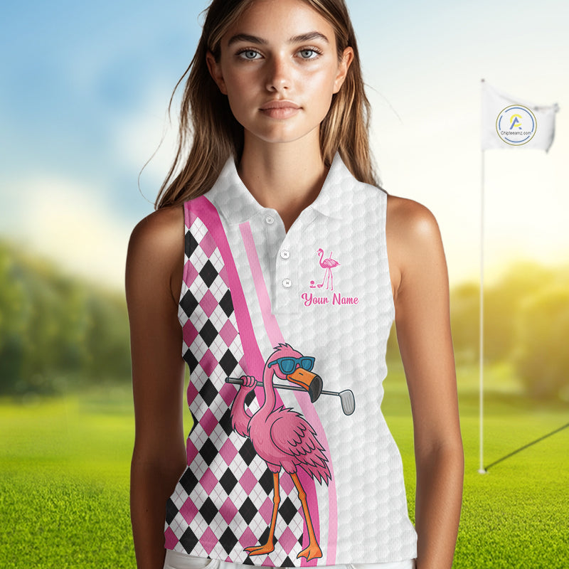Funny Women Sleeveless Polo Shirt custom pink and black argyle pattern flamingo white golf shirts NQS10252