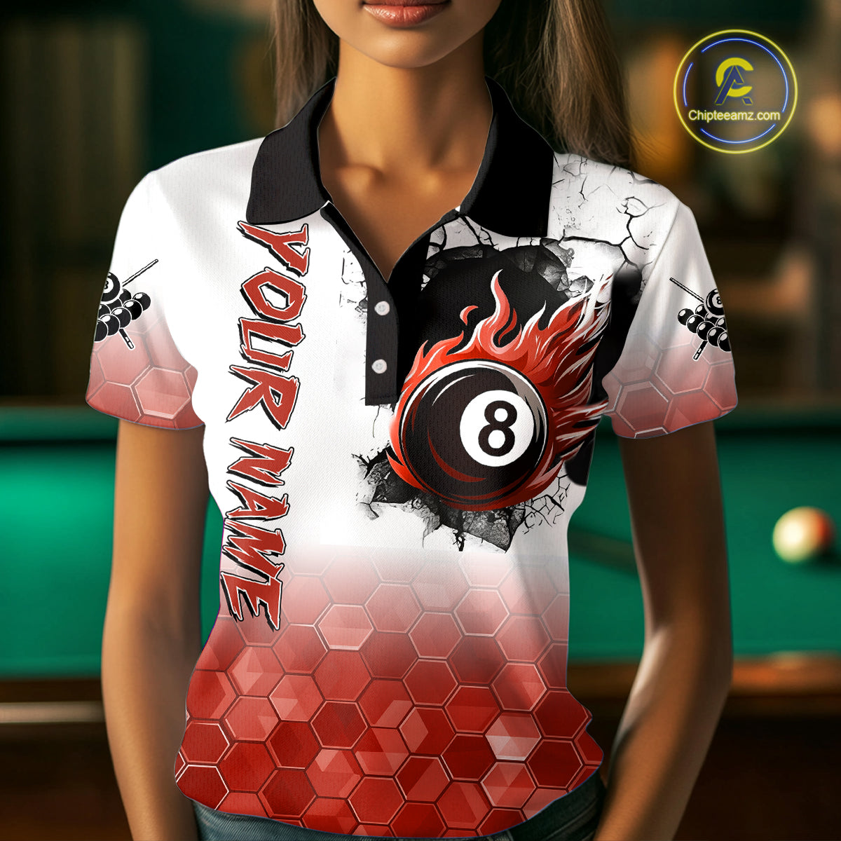 Custom White And Red Hexagon 8 Ball Flame Billiard Shirt For Women, Funny Pool Team Jersey TDM4554