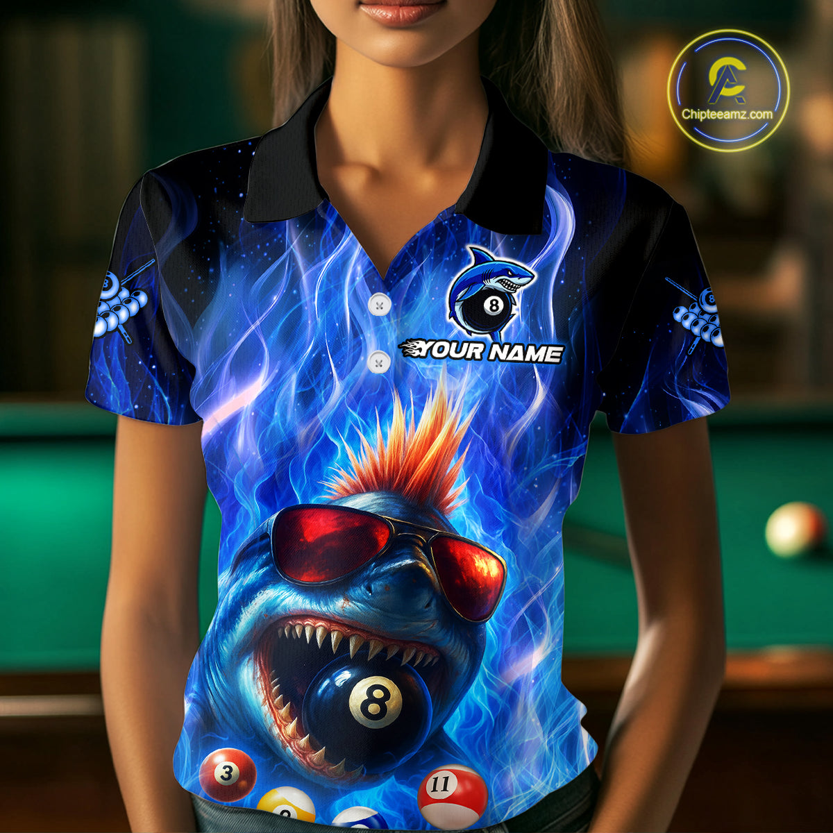 Personalized Blue Funny Shark Flame Women's Billiards Shirts Custom 8 Ball Billiard Team Jersey TDM5214