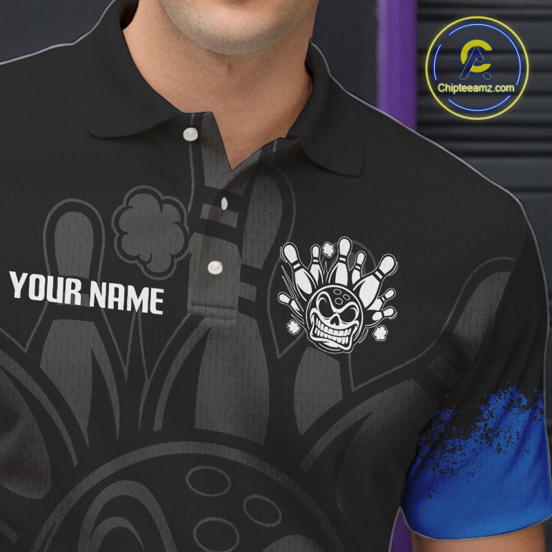 Black and Blue Funny Bowling Polo, Quarter Zip Shirt for Men Custom Bowling Team Jersey NQS9982