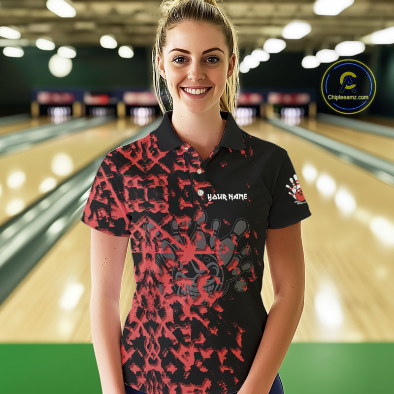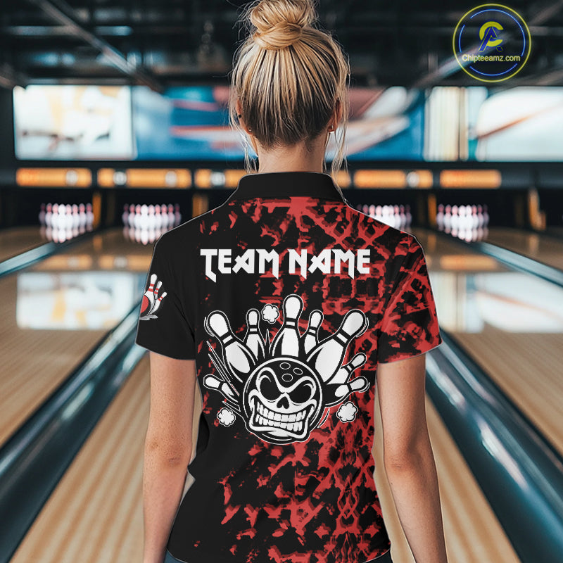 Black and Red Camo Funny Skull Bowling Polo, Quarter Zip Shirt for Women Custom Bowling Team Jersey NQS9969