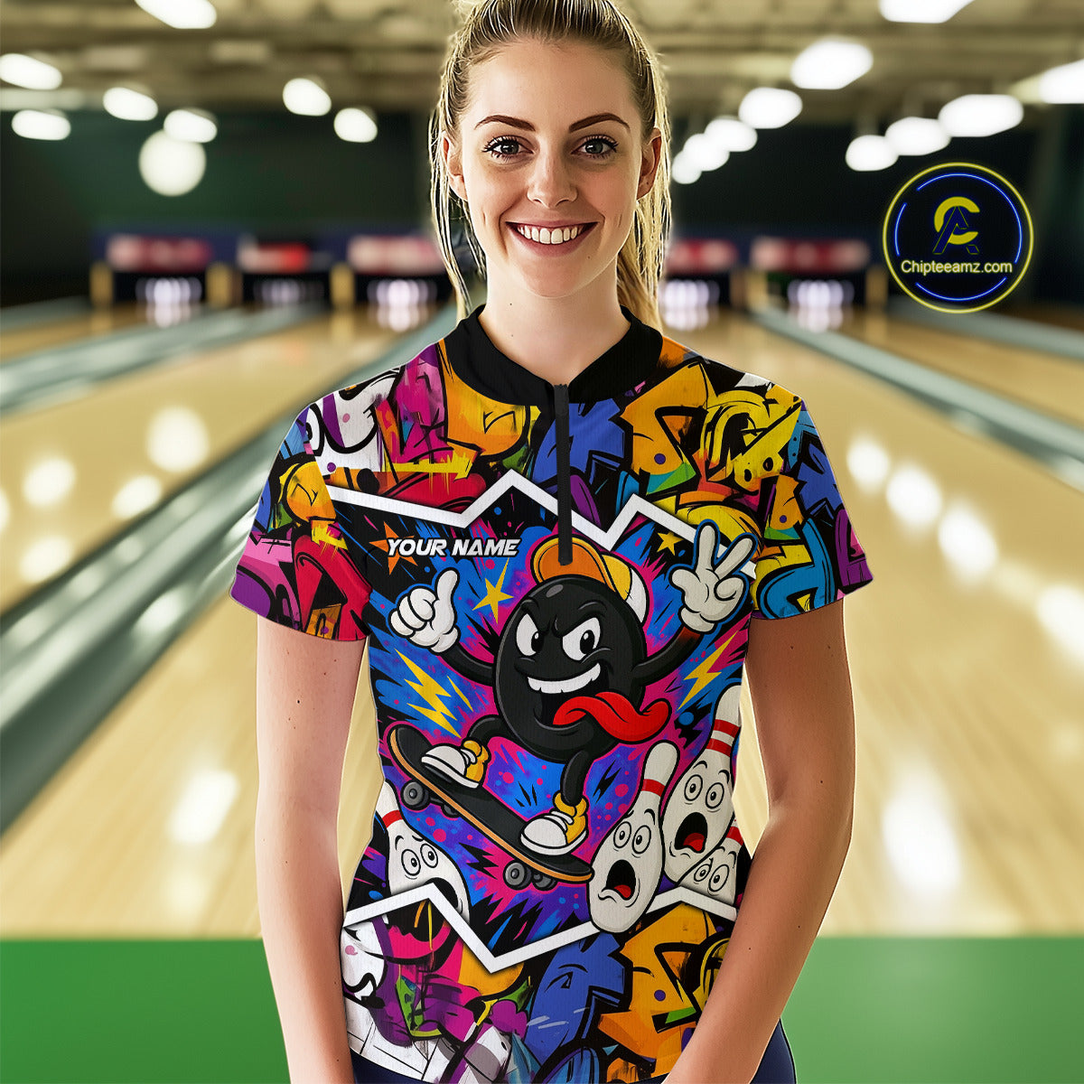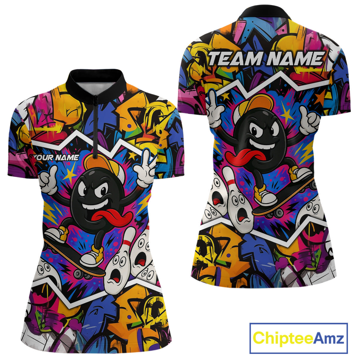 Colorful graffiti pattern Funny Bowling polo, quarter zip shirts for Women custom Bowling team jersey NQS10389