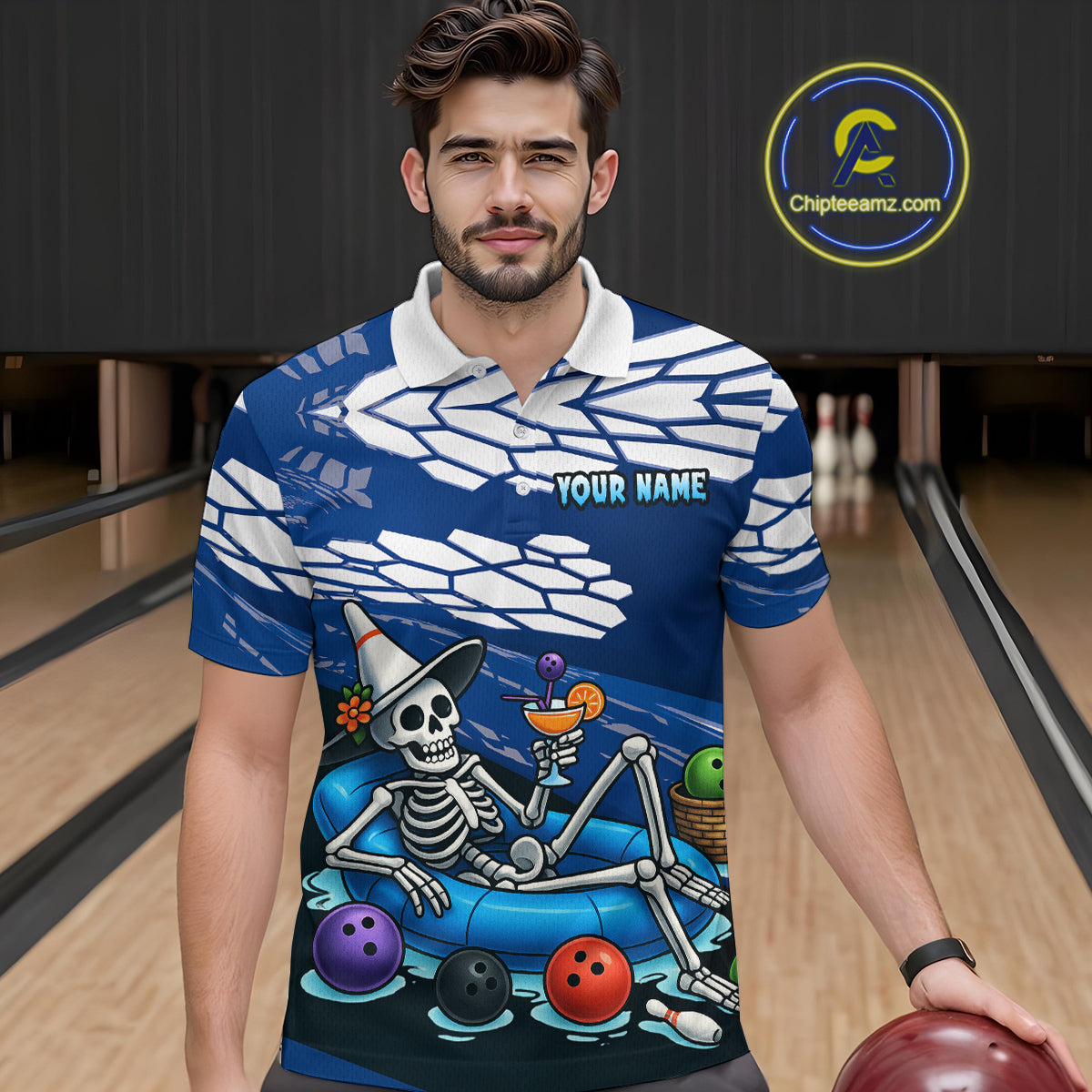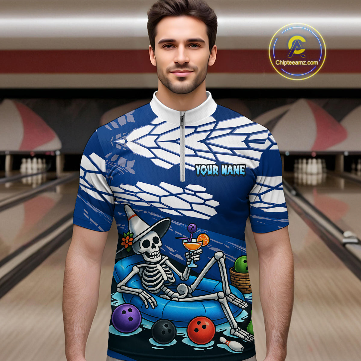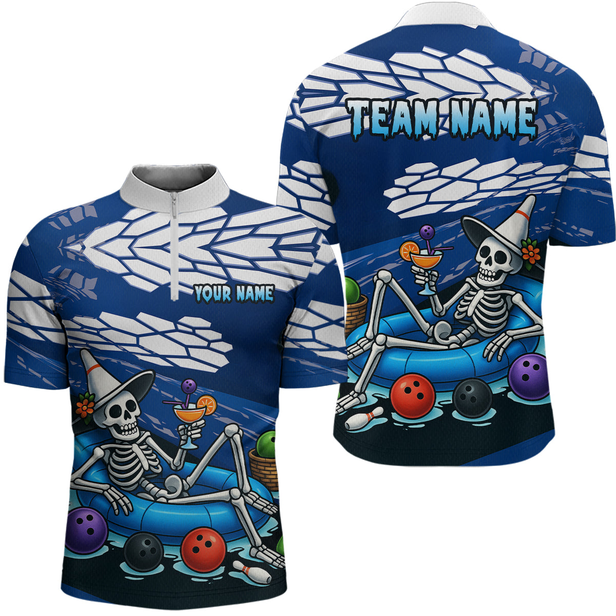 Custom Blue Funny Skull Bowling Team Shirt Polo & Quarter-Zip Bowling League Jersey for Men QZT755