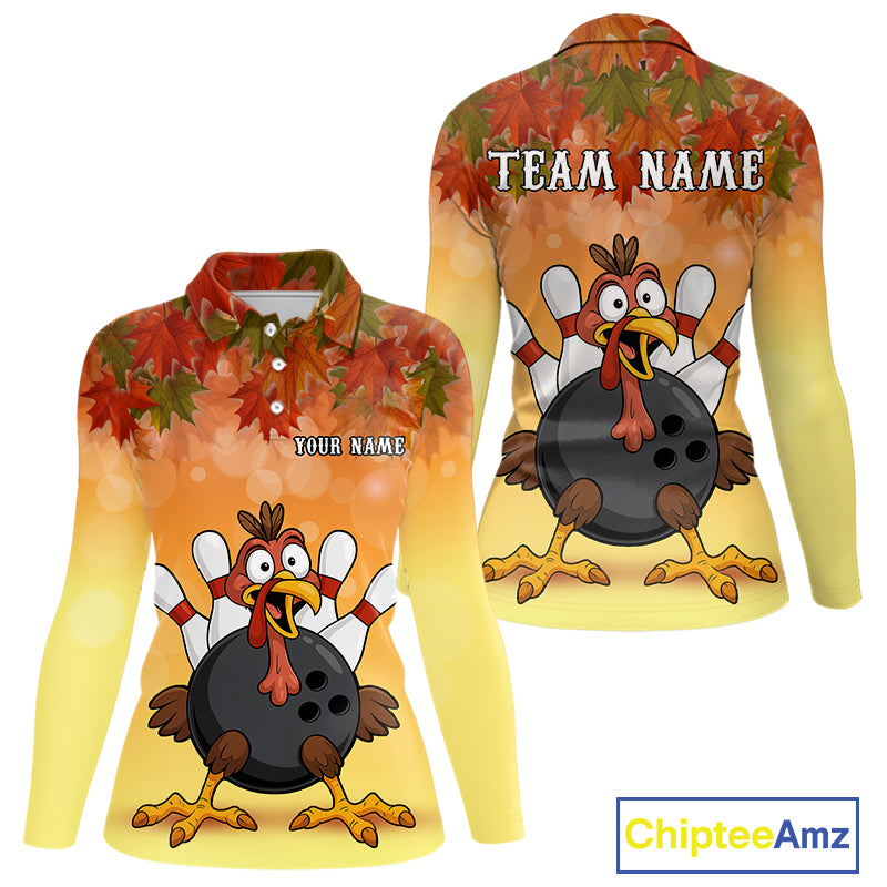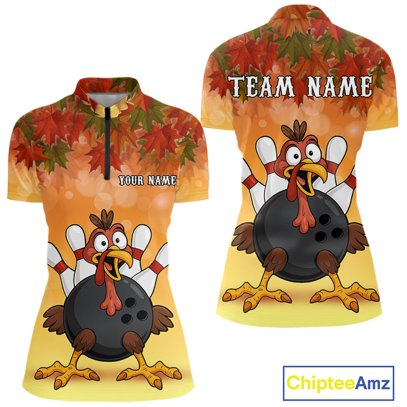 Custom Funny Turkey Bowling Shirt For Women, maple leaf pattern Thanksgiving Bowling Team Uniform NQS10368