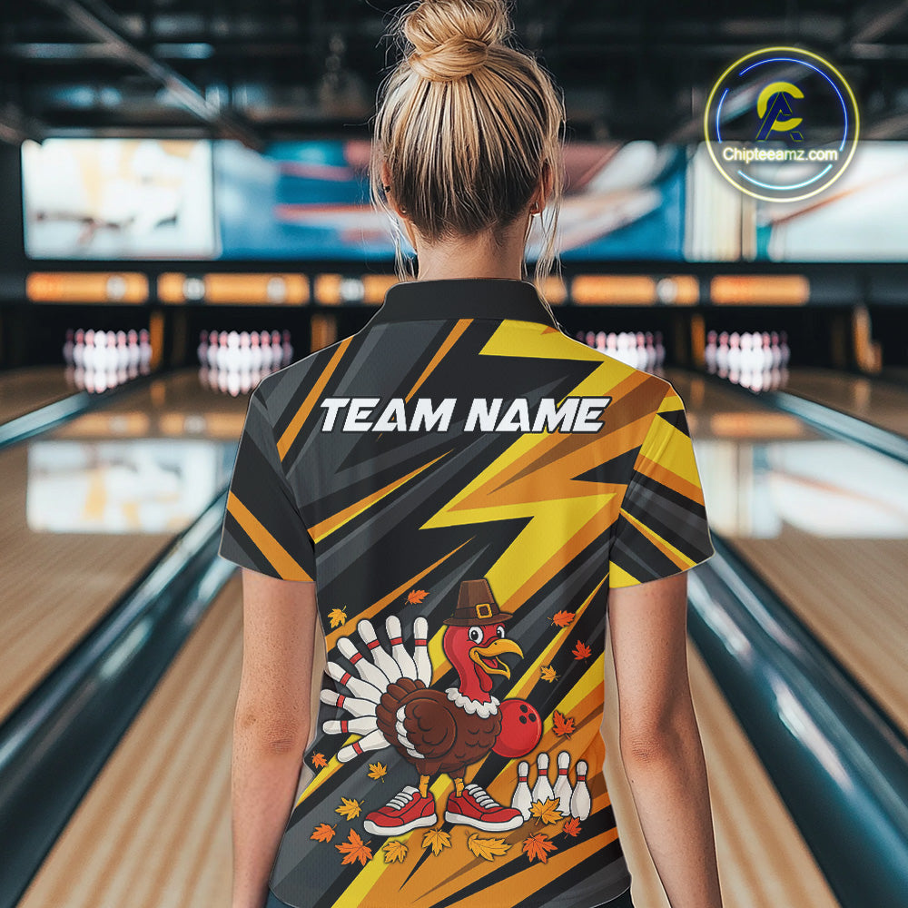 Custom Funny Turkey Bowling Shirts For Women, Black and Yellow Camo Thanksgiving Bowling Shirt Team NQS10683