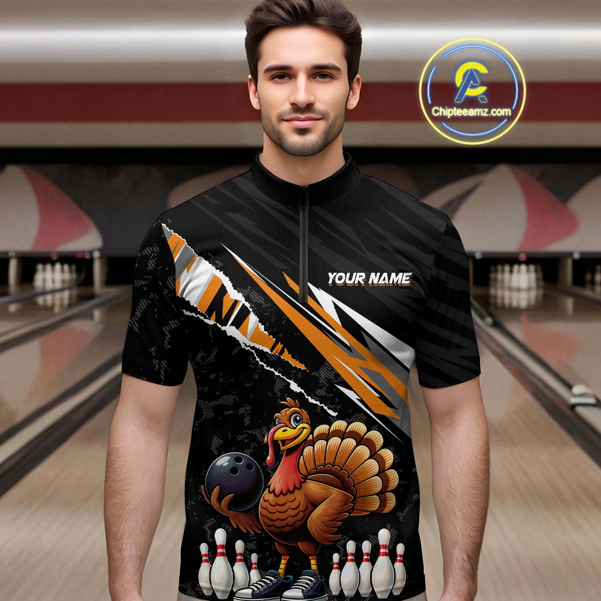 Custom Orange Funny Turkey Bowling Jersey for Men Thanksgiving Bowling Shirts Polo & 1/4 Zip HNT117