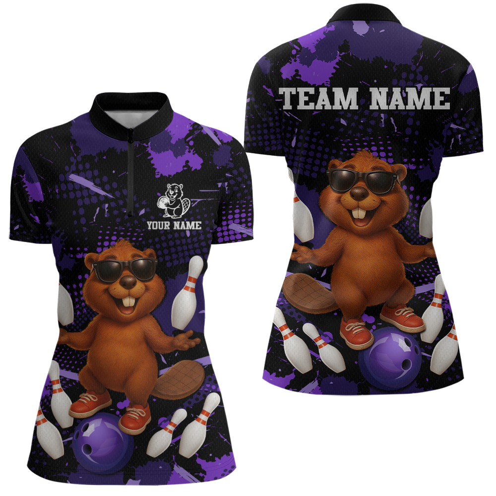 Custom Purple Funny Beaver Bowling Team Shirt Women Bowling League Jersey Polo Bowling Outfit QZT764
