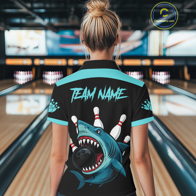 Funny Cyan Blue Shark Women Bowling Polo, Quarter Zip Shirts Custom Team Shark Bowling Outfit Jersey NQS11042