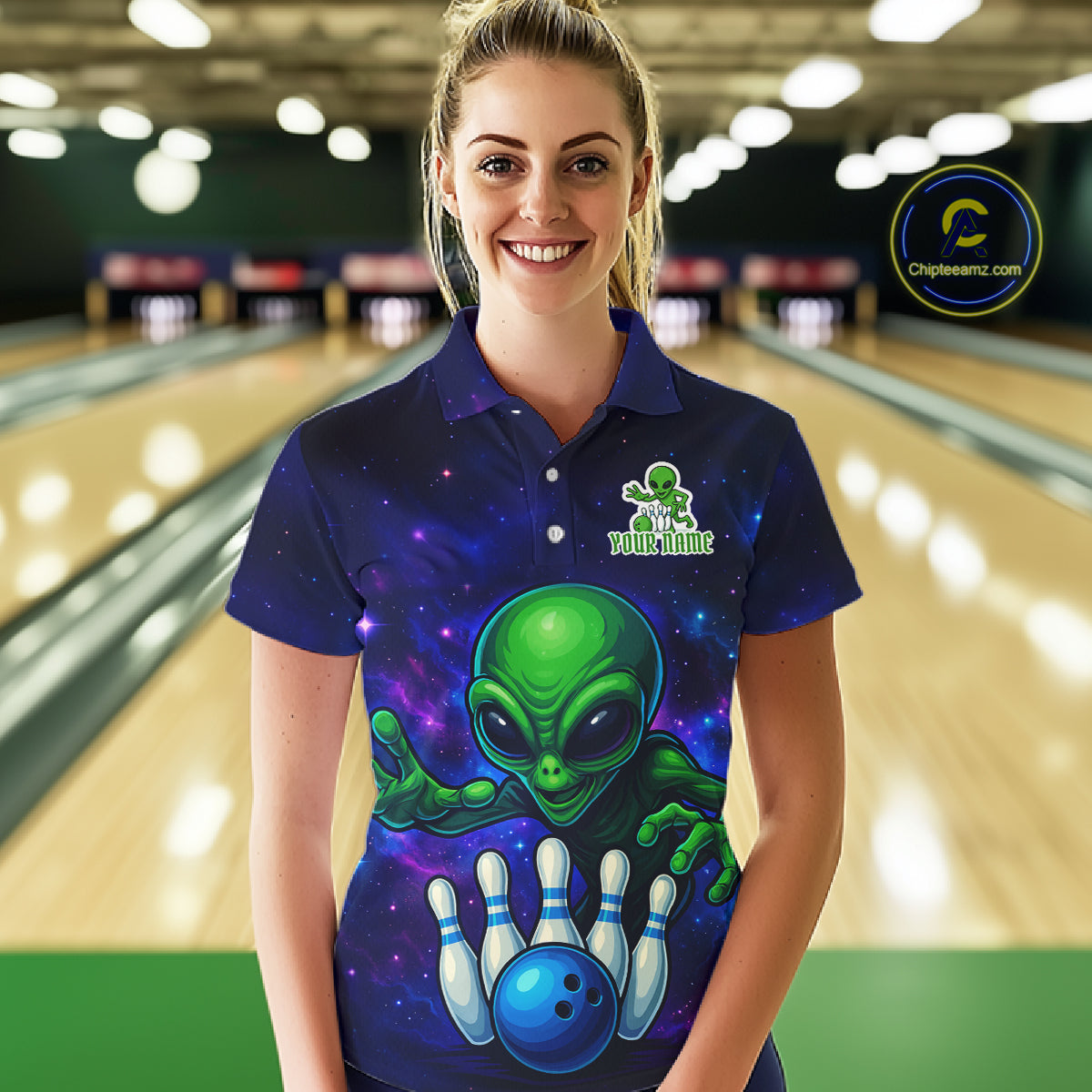 Funny Galaxy Alien Bowling Polo, 1/4 Zip Shirt For Women Custom Bowling Team Outfit, Gift For Bowler NQS10729