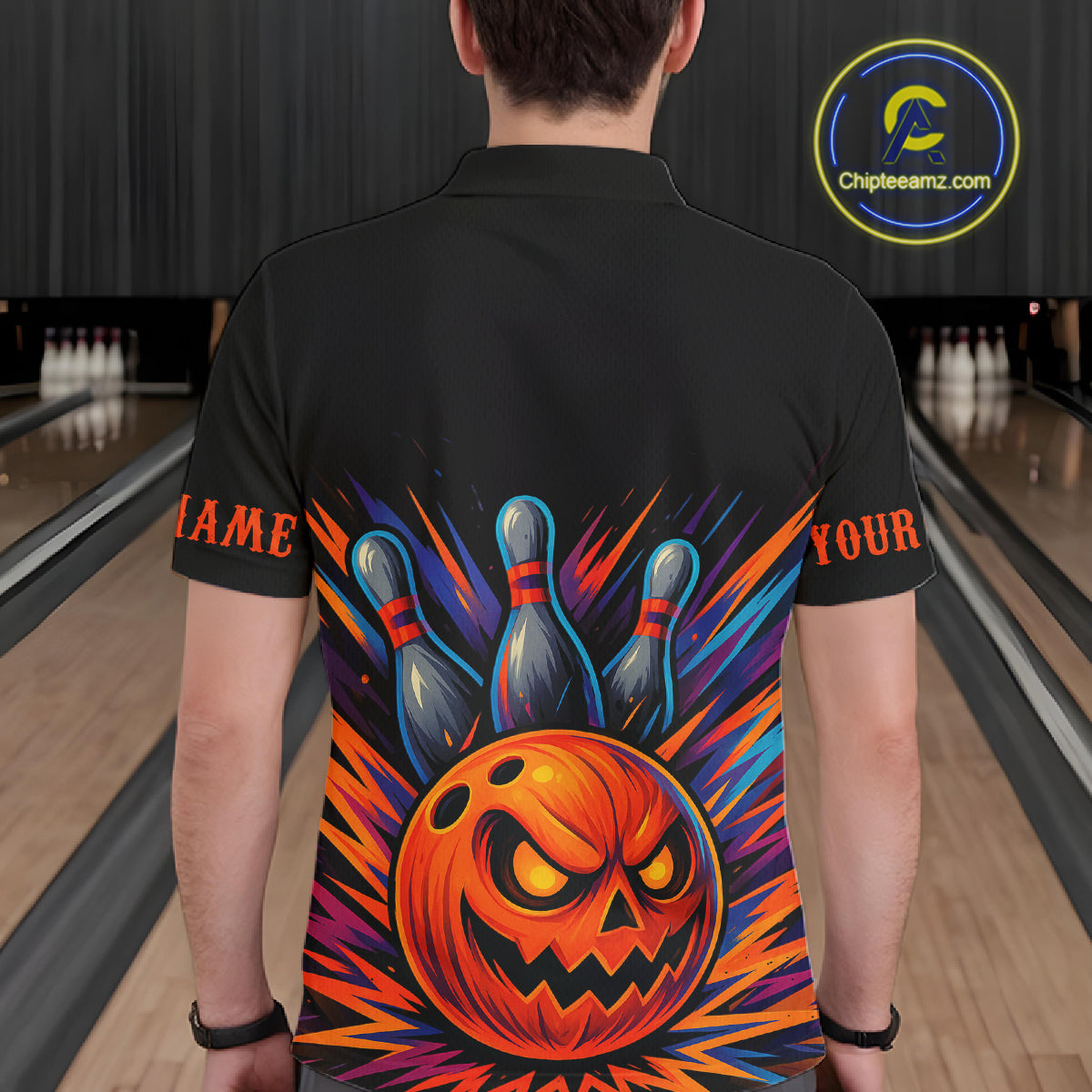 Funny Orange and Black Pumpkin Halloween Bowling Polo, 1/4 Zip Shirts For Men, Bowling Team Jersey NQS10470